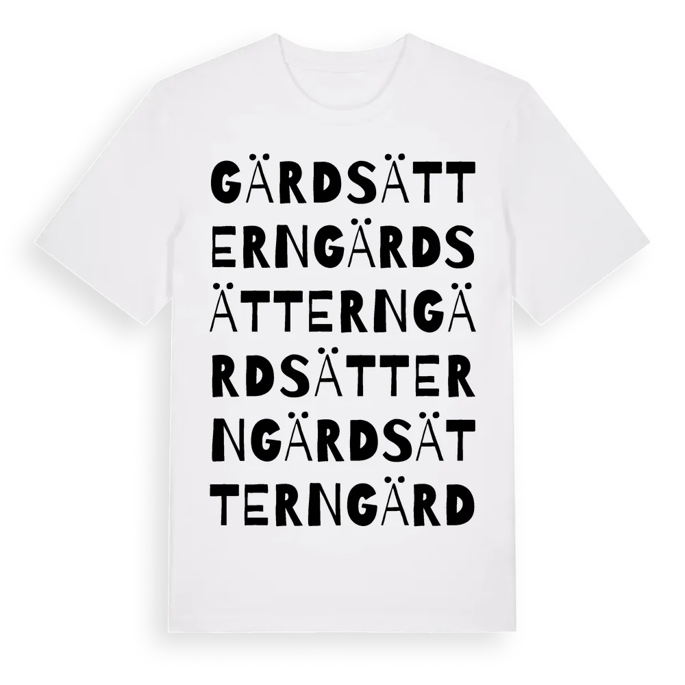 Gärdsättern ordlek t-shirt är inspirerad av Gärdsättern i Värmlands län, Sverige. Tröjan är designad för dig som har en speciell koppling till platsen – oavsett om du bor här, har rötterna här eller bara älskar Gärdsättern.