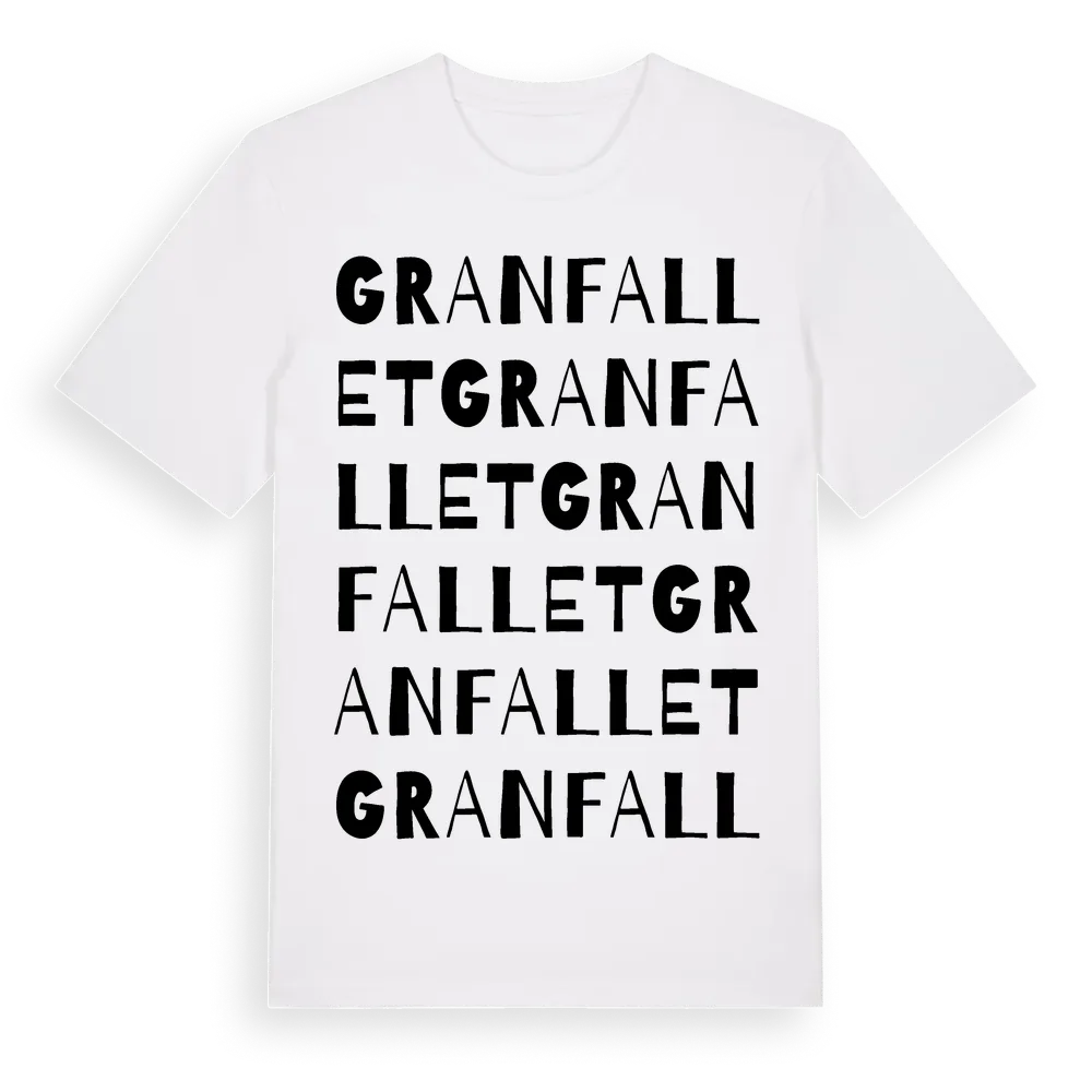 Granfallet ordlek t-shirt är inspirerad av Granfallet i Värmlands län, Sverige. Tröjan är designad för dig som har en speciell koppling till platsen – oavsett om du bor här, har rötterna här eller bara älskar Granfallet.