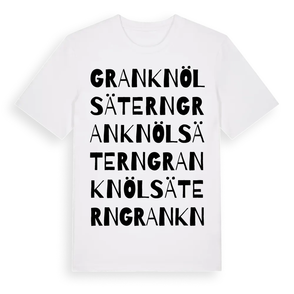 Granknölsätern ordlek t-shirt är inspirerad av Granknölsätern i Värmlands län, Sverige. Tröjan är designad för dig som har en speciell koppling till platsen – oavsett om du bor här, har rötterna här eller bara älskar Granknölsätern.