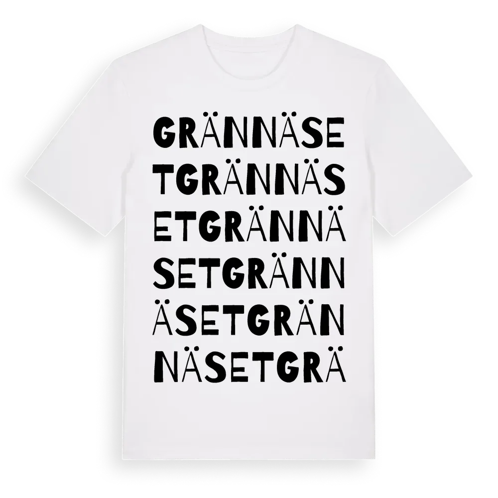 Grännäset ordlek t-shirt är inspirerad av Grännäset i Värmlands län, Sverige. Tröjan är designad för dig som har en speciell koppling till platsen – oavsett om du bor här, har rötterna här eller bara älskar Grännäset.