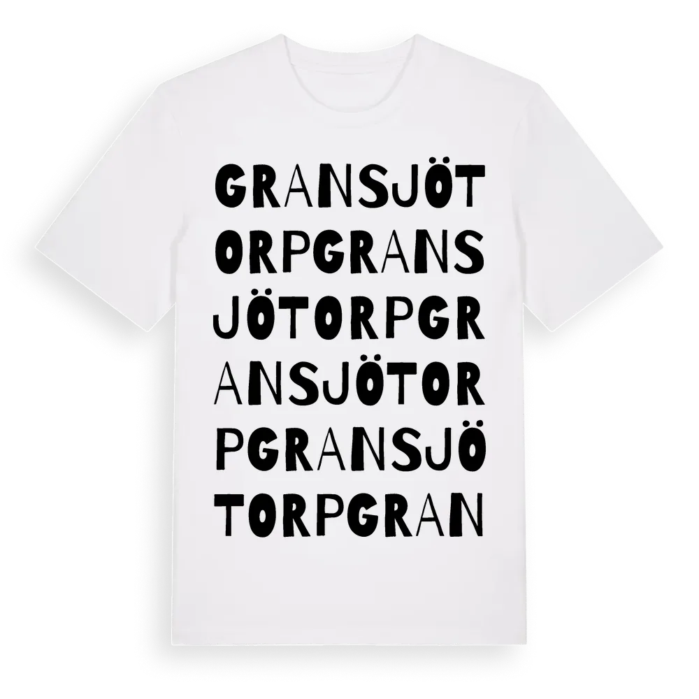 Gransjötorp ordlek t-shirt är inspirerad av Gransjötorp i Värmlands län, Sverige. Tröjan är designad för dig som har en speciell koppling till platsen – oavsett om du bor här, har rötterna här eller bara älskar Gransjötorp.