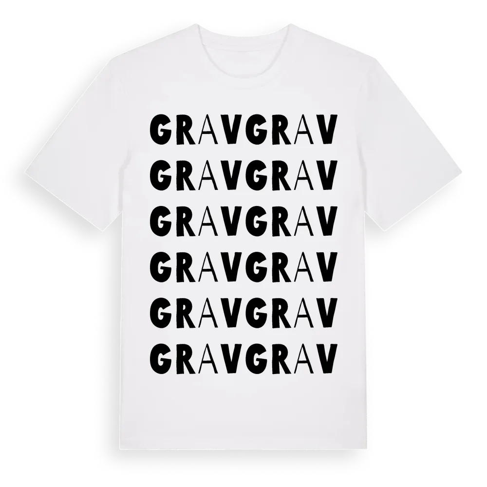Grav ordlek t-shirt är inspirerad av byn Grav i Värmlands län, Sverige. Tröjan är designad för dig som har en speciell koppling till platsen – oavsett om du bor här, har rötterna här eller bara älskar Grav.
