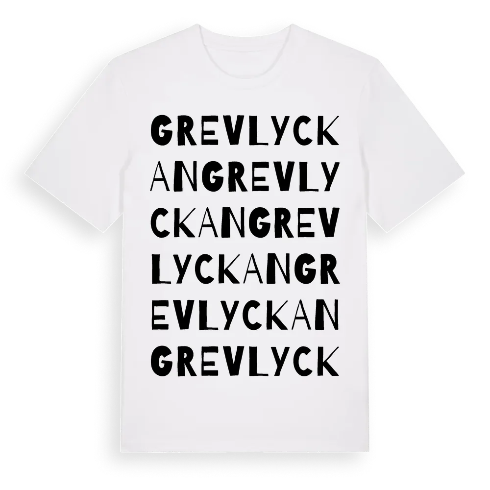 Grevlyckan ordlek t-shirt är inspirerad av byn Grevlyckan i Värmlands län, Sverige. Tröjan är designad för dig som har en speciell koppling till platsen – oavsett om du bor här, har rötterna här eller bara älskar Grevlyckan.