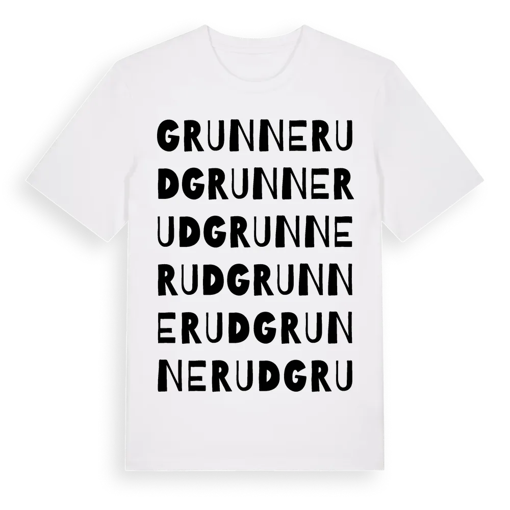 Grunnerud ordlek t-shirt är inspirerad av Grunnerud i Värmlands län, Sverige. Tröjan är designad för dig som har en speciell koppling till platsen – oavsett om du bor här, har rötterna här eller bara älskar Grunnerud.