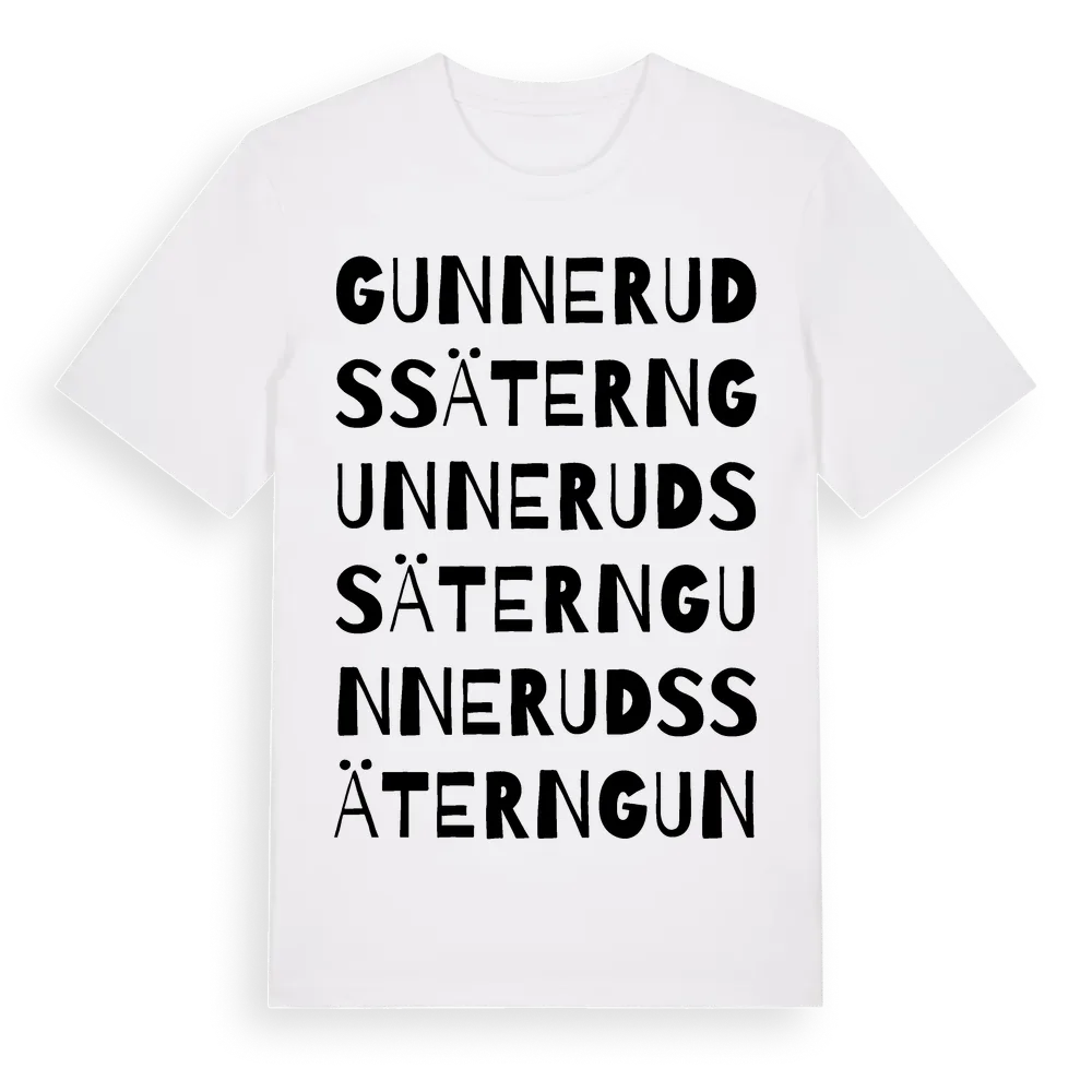 Gunnerudssätern ordlek t-shirt är inspirerad av Gunnerudssätern i Värmlands län, Sverige. Tröjan är designad för dig som har en speciell koppling till platsen – oavsett om du bor här, har rötterna här eller bara älskar Gunnerudssätern.