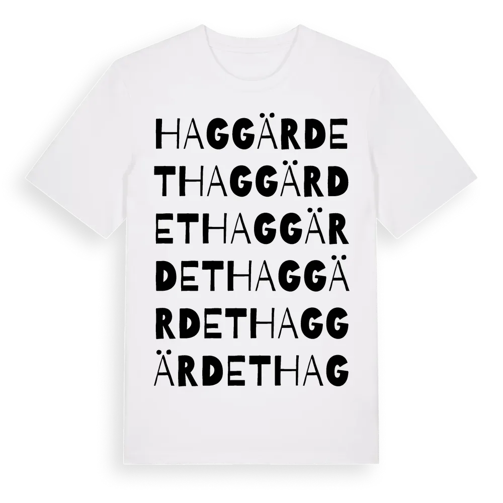 Haggärdet ordlek t-shirt är inspirerad av Haggärdet i Värmlands län, Sverige. Tröjan är designad för dig som har en speciell koppling till platsen – oavsett om du bor här, har rötterna här eller bara älskar Haggärdet.