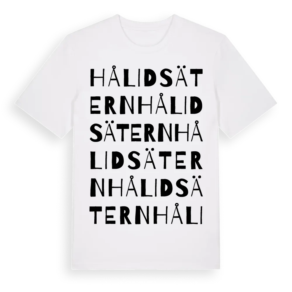 Hålidsätern ordlek t-shirt är inspirerad av Hålidsätern i Värmlands län, Sverige. Tröjan är designad för dig som har en speciell koppling till platsen – oavsett om du bor här, har rötterna här eller bara älskar Hålidsätern.