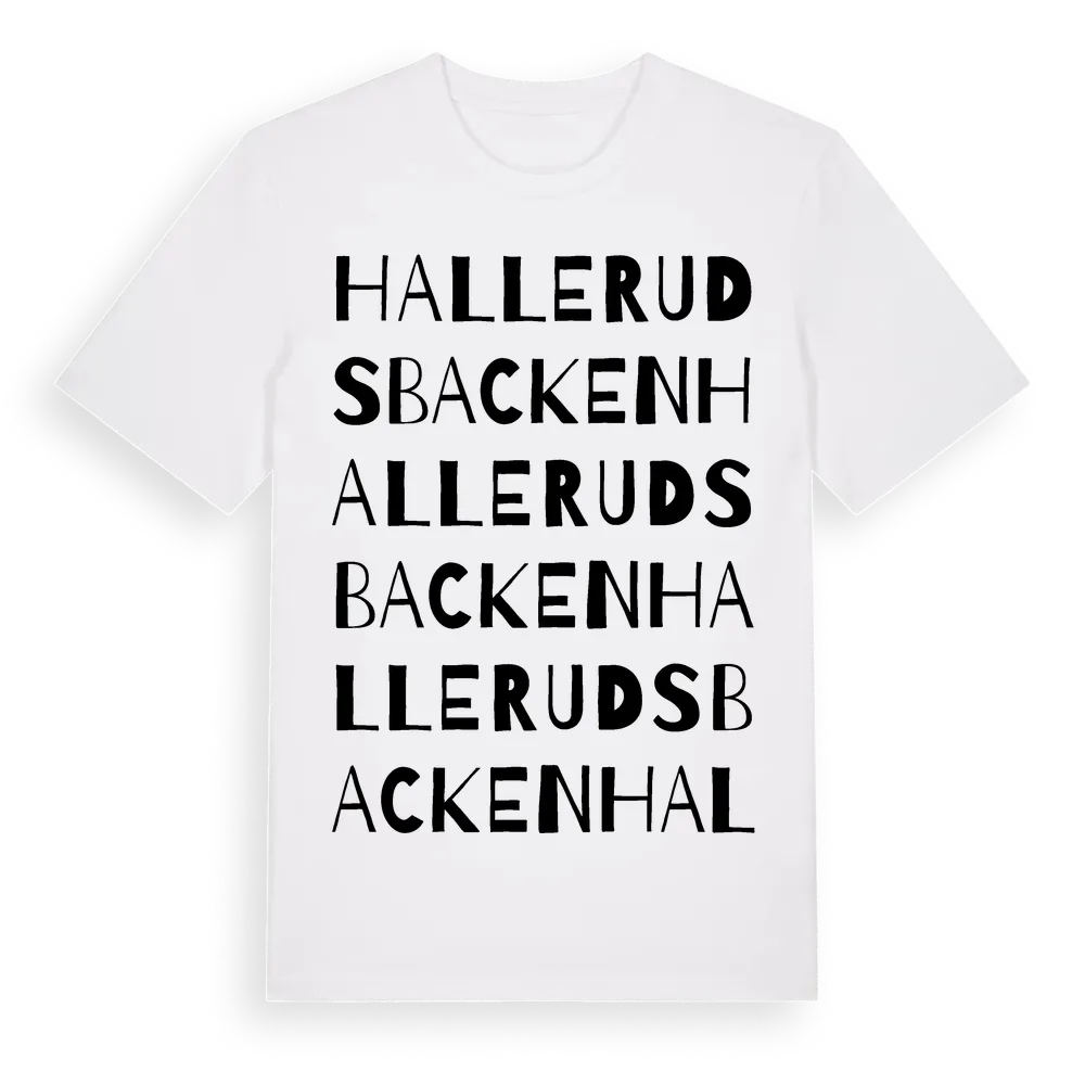 Hallerudsbacken ordlek t-shirt är inspirerad av byn Hallerudsbacken i Värmlands län, Sverige. Tröjan är designad för dig som har en speciell koppling till platsen – oavsett om du bor här, har rötterna här eller bara älskar Hallerudsbacken.