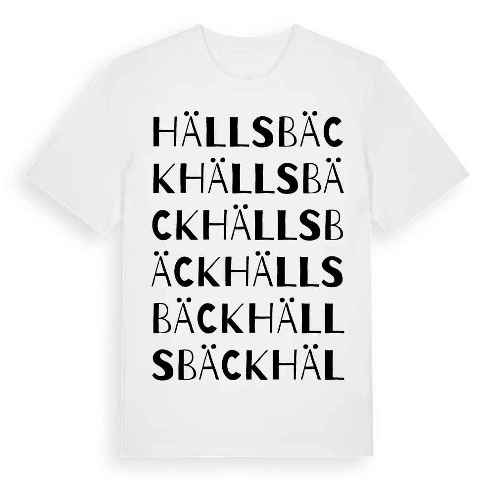 Hällsbäck ordlek t-shirt är inspirerad av Hällsbäck i Värmlands län, Sverige. Tröjan är designad för dig som har en speciell koppling till platsen – oavsett om du bor här, har rötterna här eller bara älskar Hällsbäck.