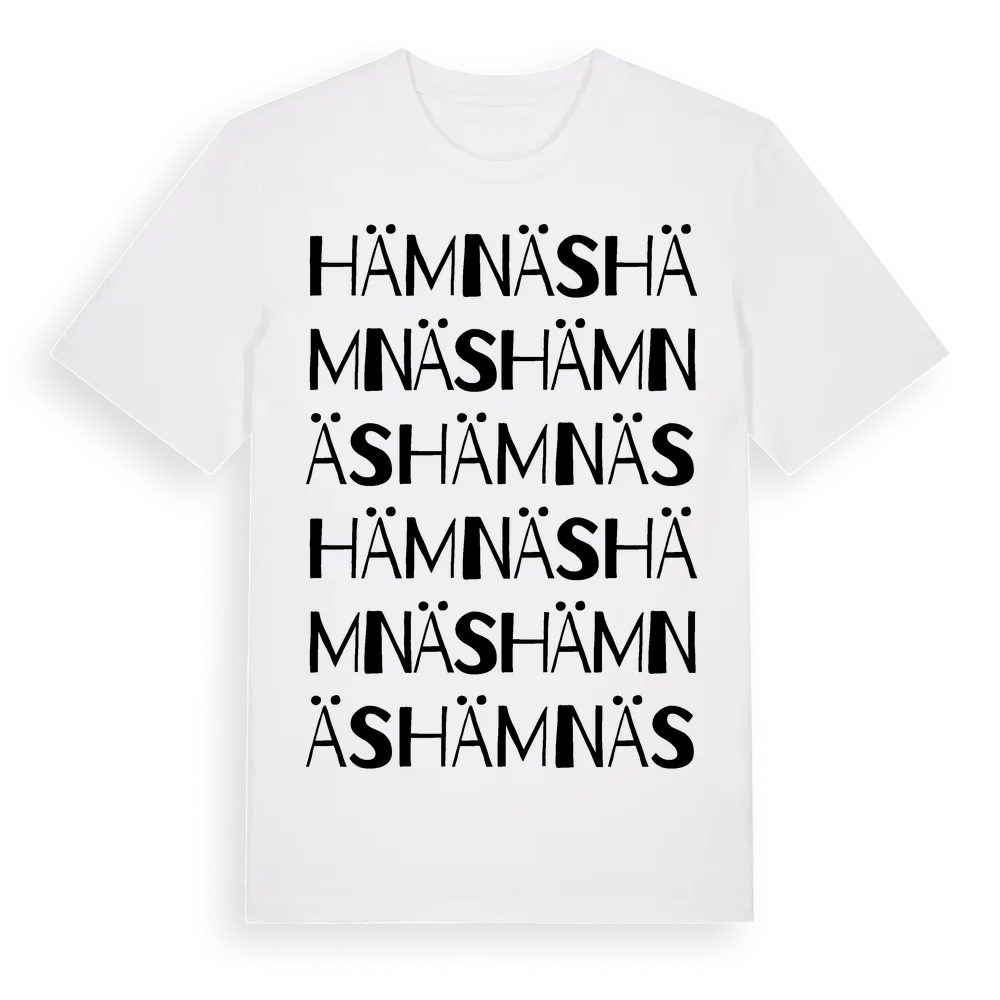 Hämnäs ordlek t-shirt är inspirerad av Hämnäs i Värmlands län, Sverige. Tröjan är designad för dig som har en speciell koppling till platsen – oavsett om du bor här, har rötterna här eller bara älskar Hämnäs.