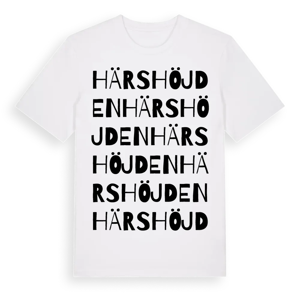 Härshöjden ordlek t-shirt är inspirerad av Härshöjden i Värmlands län, Sverige. Tröjan är designad för dig som har en speciell koppling till platsen – oavsett om du bor här, har rötterna här eller bara älskar Härshöjden.
