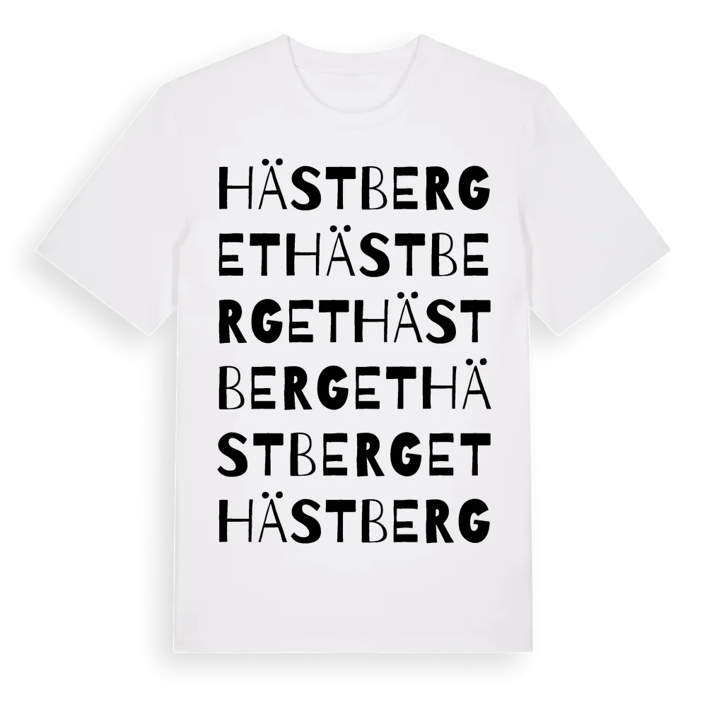Hästberget ordlek t-shirt är inspirerad av Hästberget i Värmlands län, Sverige. Tröjan är designad för dig som har en speciell koppling till platsen – oavsett om du bor här, har rötterna här eller bara älskar Hästberget.
