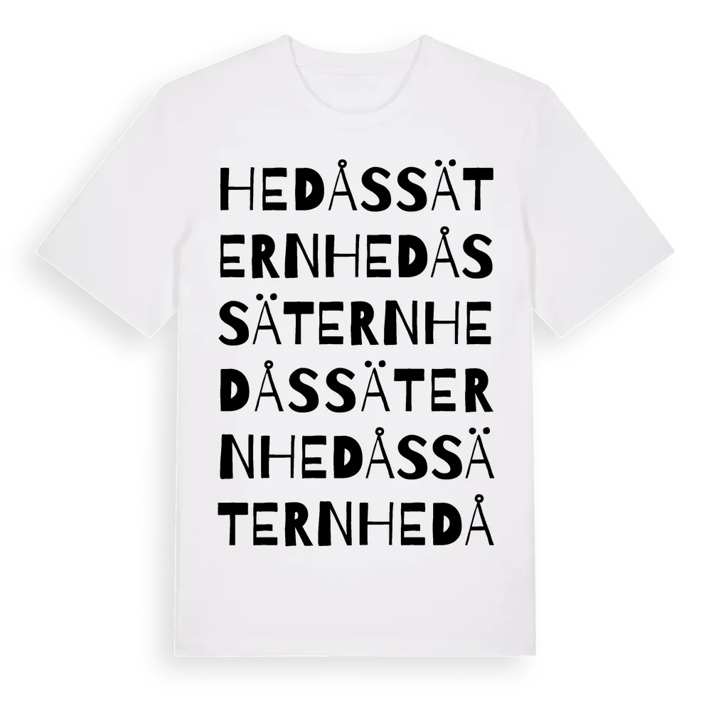 Hedåssätern ordlek t-shirt är inspirerad av Hedåssätern i Värmlands län, Sverige. Tröjan är designad för dig som har en speciell koppling till platsen – oavsett om du bor här, har rötterna här eller bara älskar Hedåssätern.