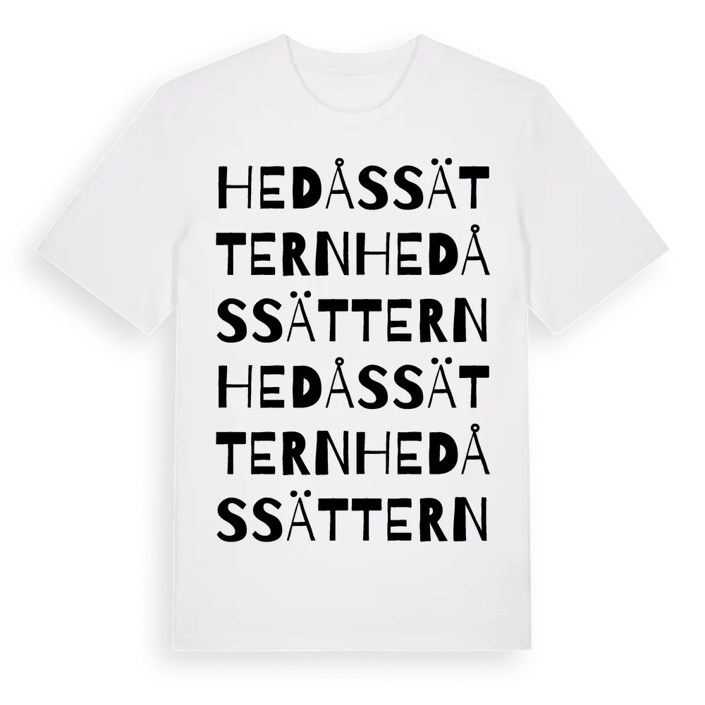 Hedåssättern ordlek t-shirt är inspirerad av Hedåssättern i Värmlands län, Sverige. Tröjan är designad för dig som har en speciell koppling till platsen – oavsett om du bor här, har rötterna här eller bara älskar Hedåssättern.