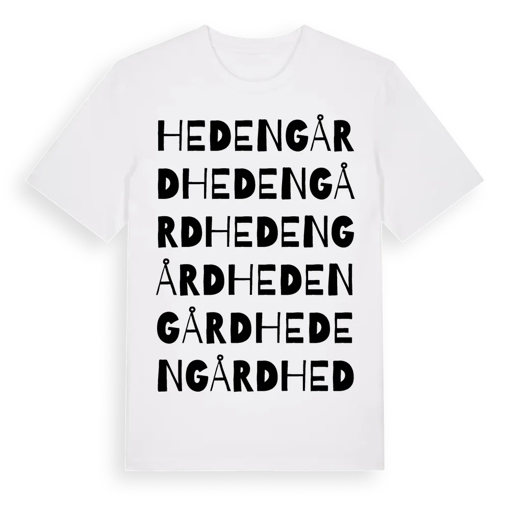 Hedengård ordlek t-shirt är inspirerad av Hedengård i Värmlands län, Sverige. Tröjan är designad för dig som har en speciell koppling till platsen – oavsett om du bor här, har rötterna här eller bara älskar Hedengård.