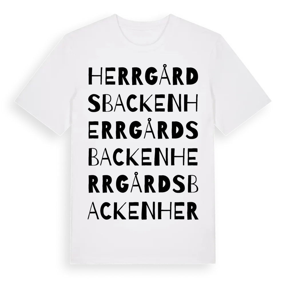 Herrgårdsbacken ordlek t-shirt är inspirerad av Herrgårdsbacken i Värmlands län, Sverige. Tröjan är designad för dig som har en speciell koppling till platsen – oavsett om du bor här, har rötterna här eller bara älskar Herrgårdsbacken.