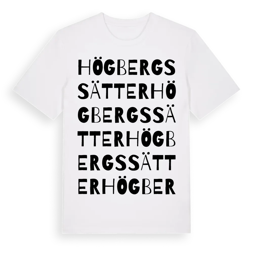 Högbergssätter ordlek t-shirt är inspirerad av byn Högbergssätter i Värmlands län, Sverige. Tröjan är designad för dig som har en speciell koppling till platsen – oavsett om du bor här, har rötterna här eller bara älskar Högbergssätter.