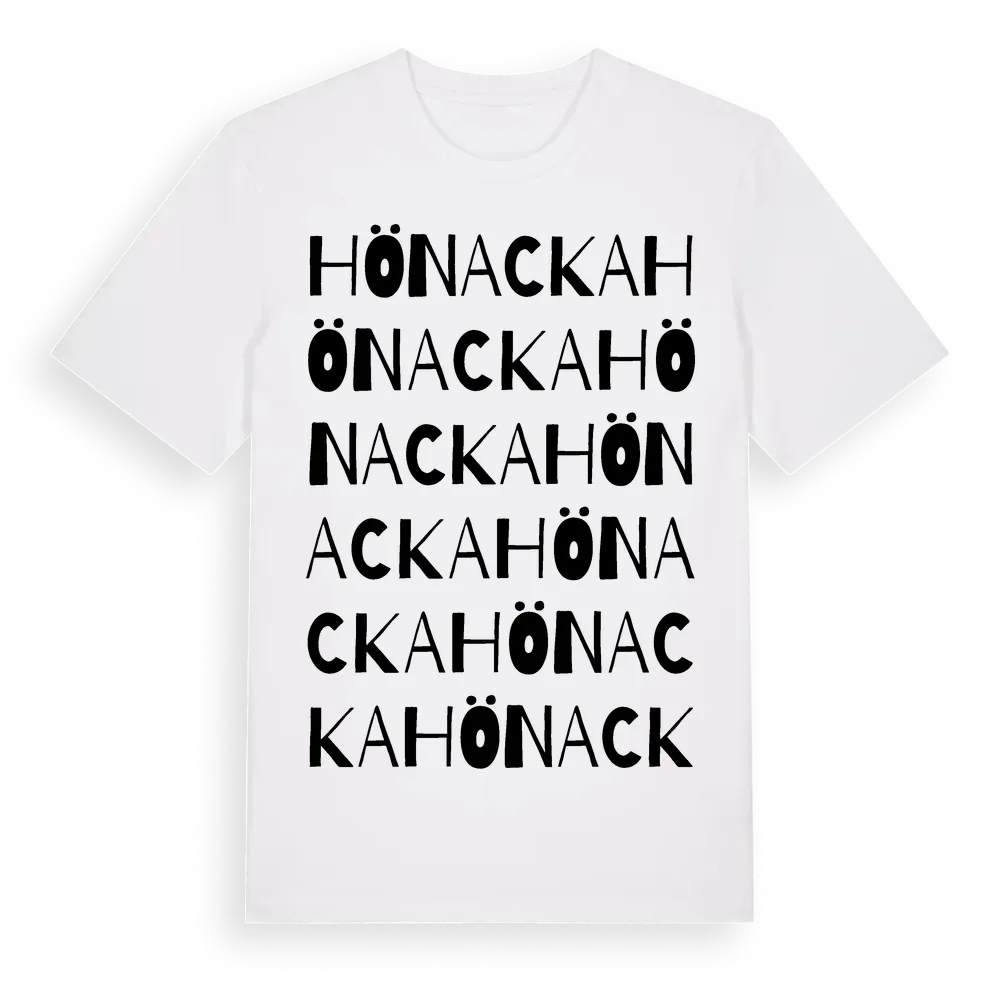 Hönacka ordlek t-shirt är inspirerad av Hönacka i Värmlands län, Sverige. Tröjan är designad för dig som har en speciell koppling till platsen – oavsett om du bor här, har rötterna här eller bara älskar Hönacka.
