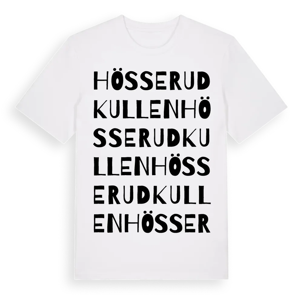 Hösserudkullen ordlek t-shirt är inspirerad av Hösserudkullen i Värmlands län, Sverige. Tröjan är designad för dig som har en speciell koppling till platsen – oavsett om du bor här, har rötterna här eller bara älskar Hösserudkullen.