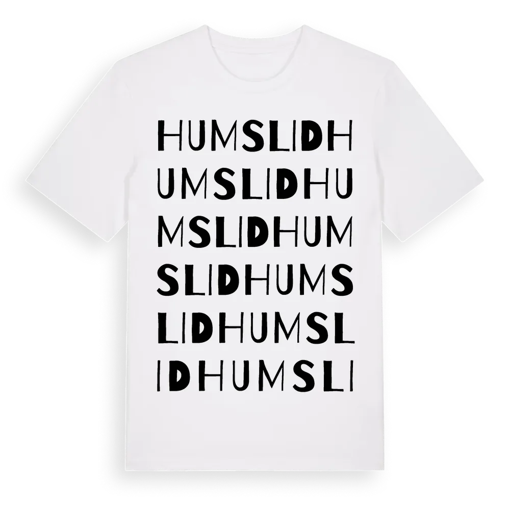 En ordlek byggd på Humslids namn. Subtilt och klurig – ett motiv som bara de som verkligen känner platsen fullt ut förstår. Premium bomull, unisex – från byn Humslid i Värmlands län.
