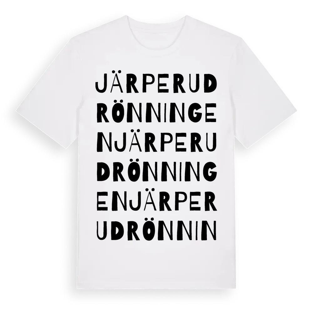 Järperudrönningen ordlek t-shirt är inspirerad av Järperudrönningen i Värmlands län, Sverige. Tröjan är designad för dig som har en speciell koppling till platsen – oavsett om du bor här, har rötterna här eller bara älskar Järperudrönningen.