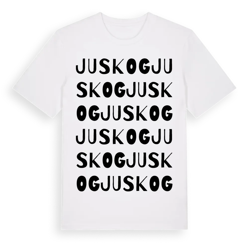 En ordlek byggd på Juskogs namn. Subtilt och klurig – ett motiv som bara de som verkligen känner platsen fullt ut förstår. Premium bomull, unisex – från Juskog i Värmlands län.