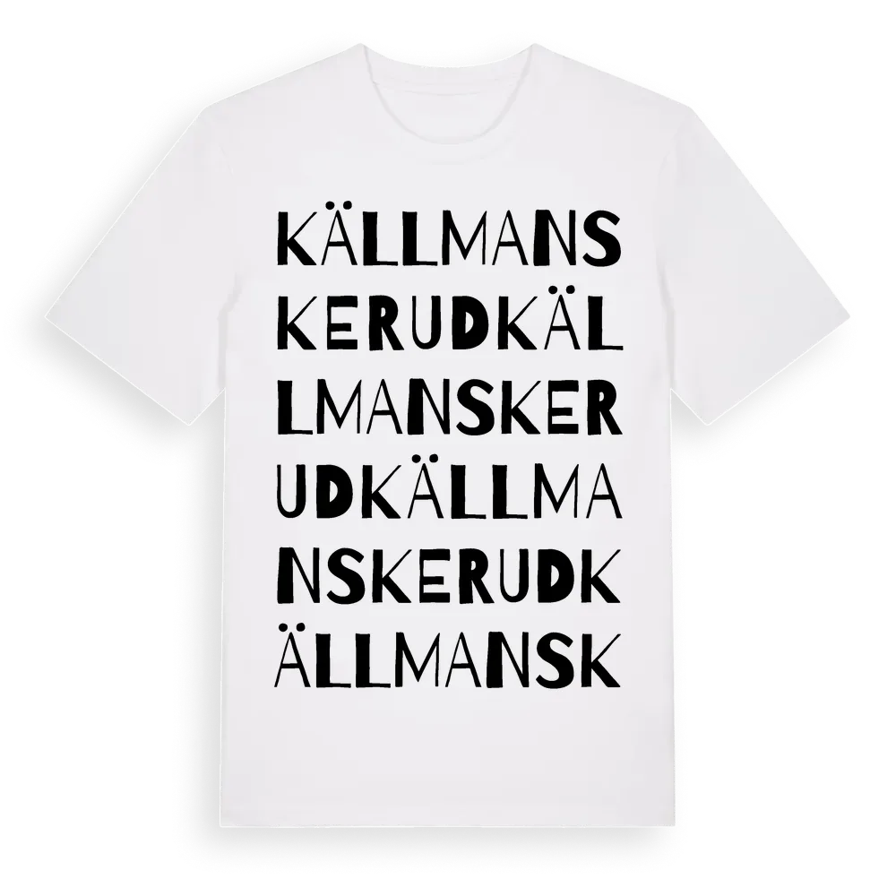Källmanskerud ordlek t-shirt är inspirerad av Källmanskerud i Värmlands län, Sverige. Tröjan är designad för dig som har en speciell koppling till platsen – oavsett om du bor här, har rötterna här eller bara älskar Källmanskerud.