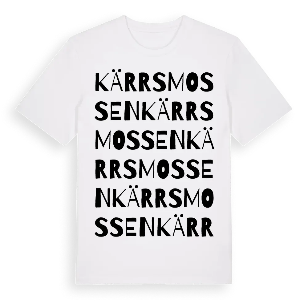 Kärrsmossen ordlek t-shirt är inspirerad av Kärrsmossen i Värmlands län, Sverige. Tröjan är designad för dig som har en speciell koppling till platsen – oavsett om du bor här, har rötterna här eller bara älskar Kärrsmossen.