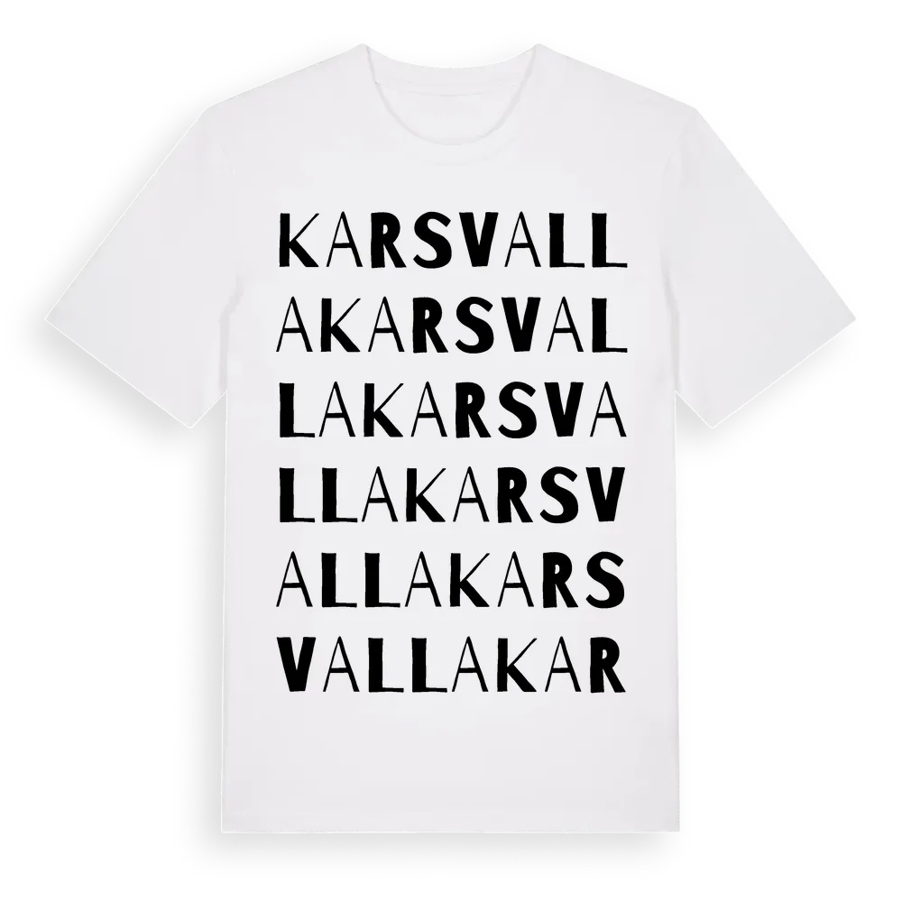 Karsvalla ordlek t-shirt är inspirerad av byn Karsvalla i Värmlands län, Sverige. Tröjan är designad för dig som har en speciell koppling till platsen – oavsett om du bor här, har rötterna här eller bara älskar Karsvalla.