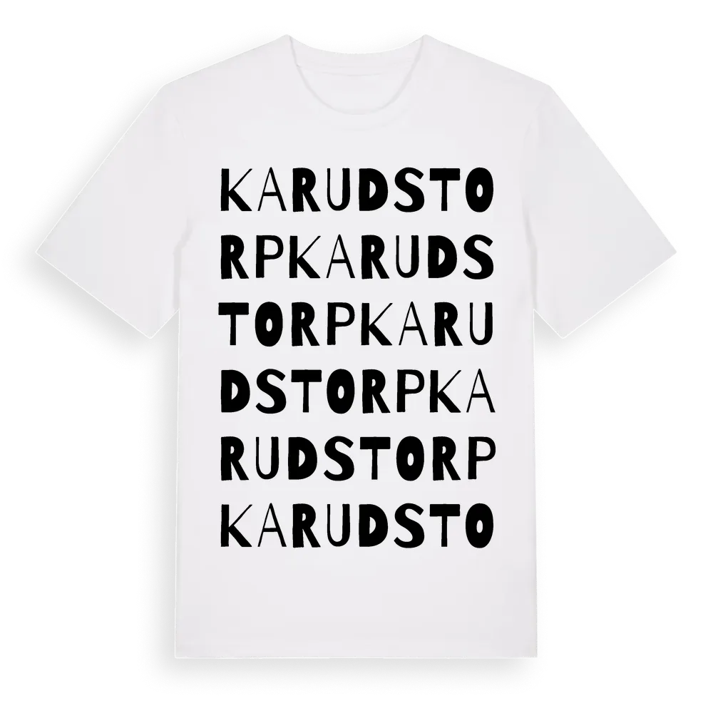 Karudstorp ordlek t-shirt är inspirerad av byn Karudstorp i Värmlands län, Sverige. Tröjan är designad för dig som har en speciell koppling till platsen – oavsett om du bor här, har rötterna här eller bara älskar Karudstorp.