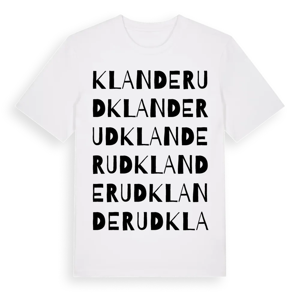 Klanderud ordlek t-shirt är inspirerad av Klanderud i Värmlands län, Sverige. Tröjan är designad för dig som har en speciell koppling till platsen – oavsett om du bor här, har rötterna här eller bara älskar Klanderud.