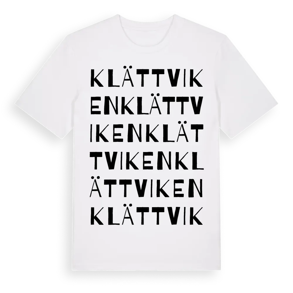 Klättviken ordlek t-shirt är inspirerad av Klättviken i Värmlands län, Sverige. Tröjan är designad för dig som har en speciell koppling till platsen – oavsett om du bor här, har rötterna här eller bara älskar Klättviken.