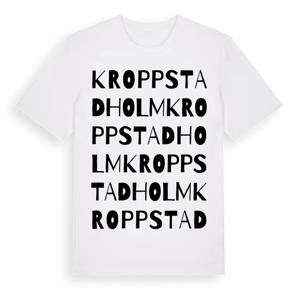 Kroppstadholm ordlek t-shirt är inspirerad av byn Kroppstadholm i Värmlands län, Sverige. Tröjan är designad för dig som har en speciell koppling till platsen – oavsett om du bor här, har rötterna här eller bara älskar Kroppstadholm.