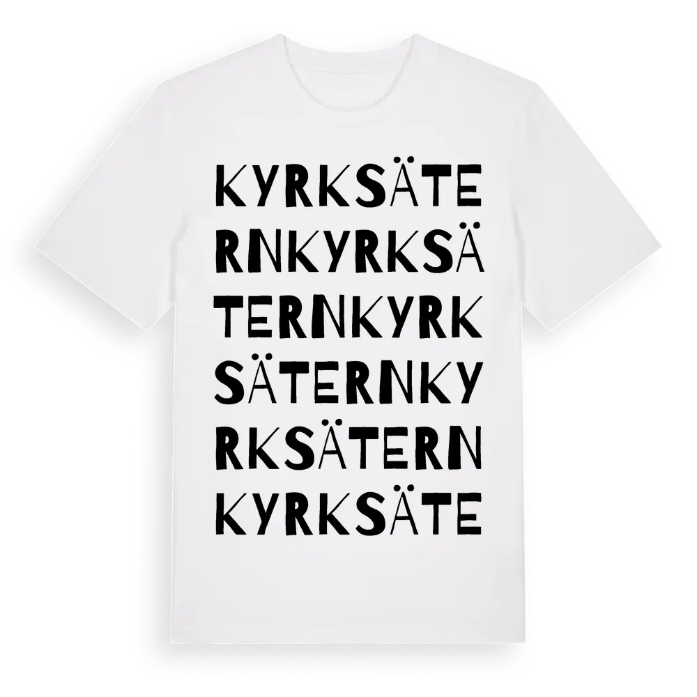 Kyrksätern ordlek t-shirt är inspirerad av Kyrksätern i Värmlands län, Sverige. Tröjan är designad för dig som har en speciell koppling till platsen – oavsett om du bor här, har rötterna här eller bara älskar Kyrksätern.