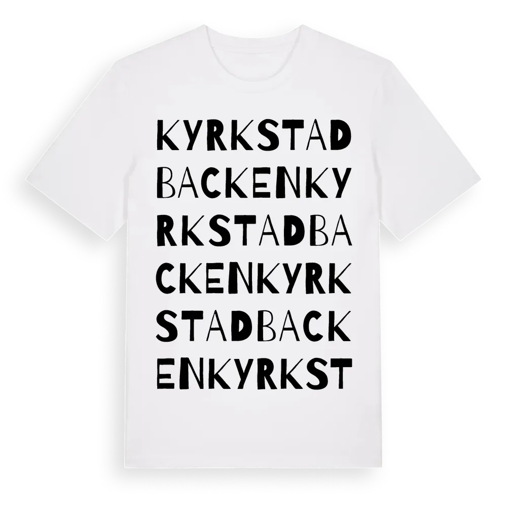 Kyrkstadbacken ordlek t-shirt är inspirerad av Kyrkstadbacken i Värmlands län, Sverige. Tröjan är designad för dig som har en speciell koppling till platsen – oavsett om du bor här, har rötterna här eller bara älskar Kyrkstadbacken.