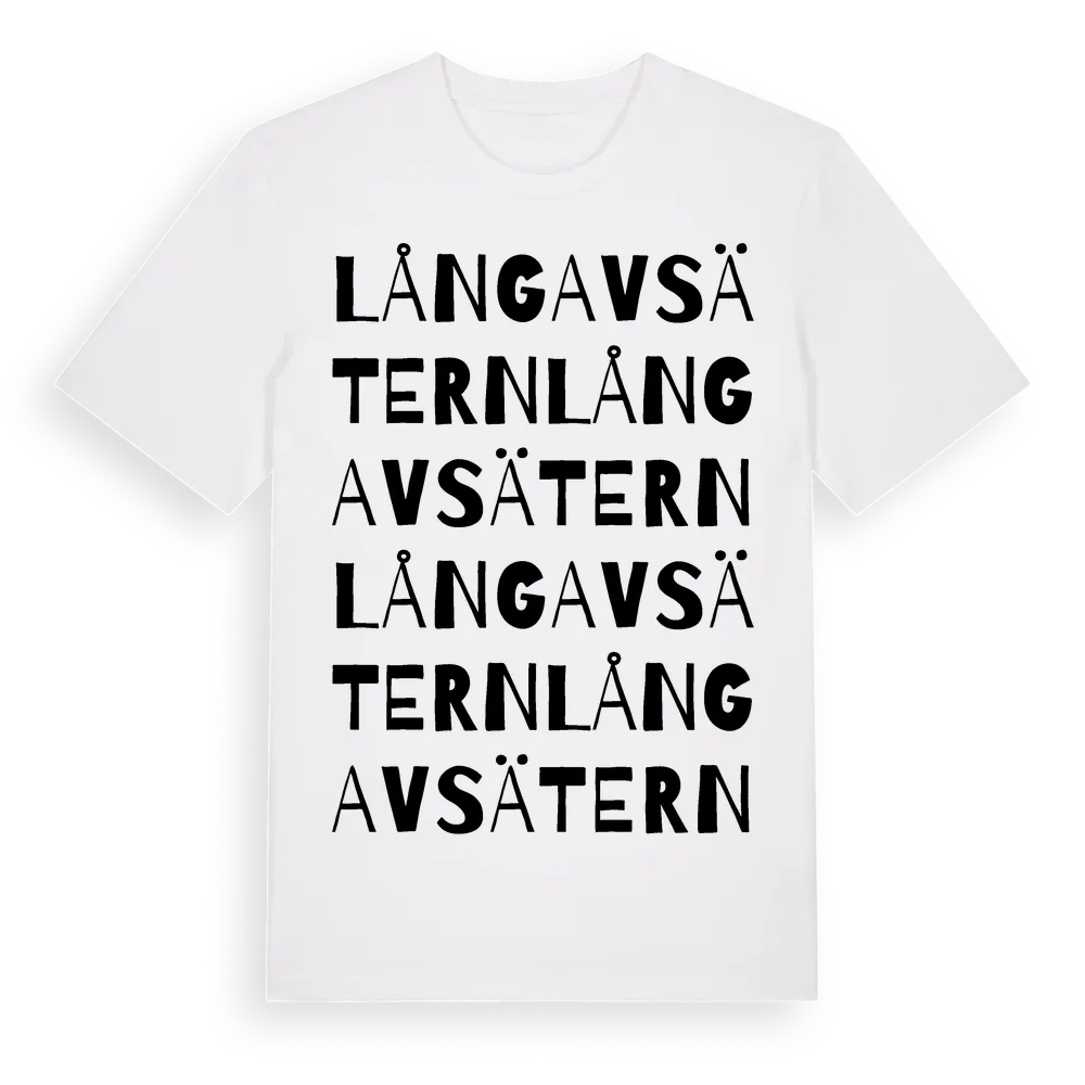 Långavsätern ordlek t-shirt är inspirerad av Långavsätern i Värmlands län, Sverige. Tröjan är designad för dig som har en speciell koppling till platsen – oavsett om du bor här, har rötterna här eller bara älskar Långavsätern.