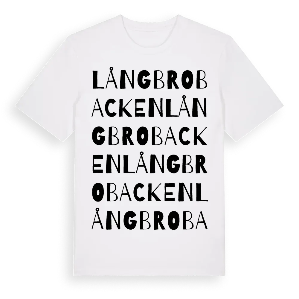 Långbrobacken ordlek t-shirt är inspirerad av Långbrobacken i Värmlands län, Sverige. Tröjan är designad för dig som har en speciell koppling till platsen – oavsett om du bor här, har rötterna här eller bara älskar Långbrobacken.