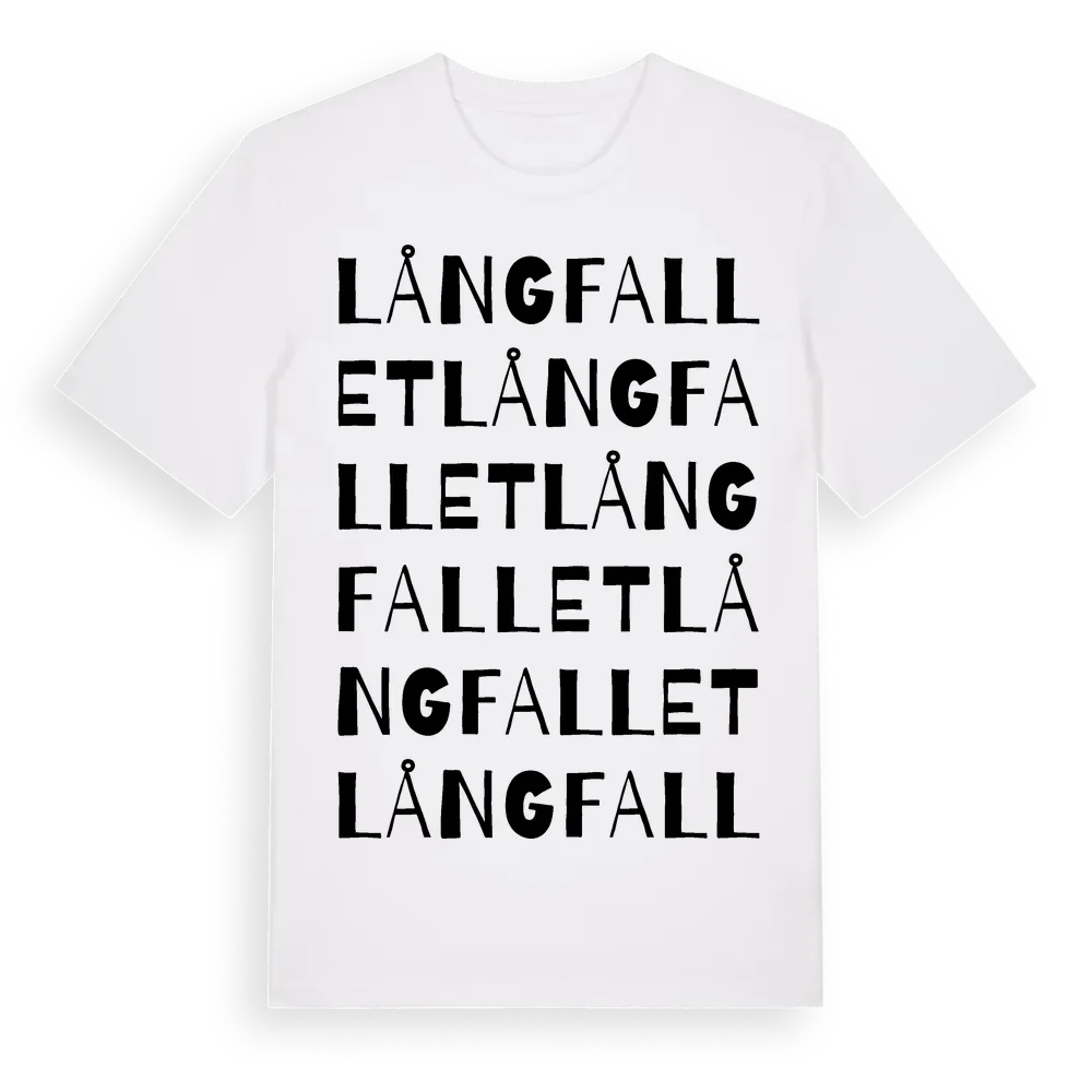 Långfallet ordlek t-shirt är inspirerad av Långfallet i Värmlands län, Sverige. Tröjan är designad för dig som har en speciell koppling till platsen – oavsett om du bor här, har rötterna här eller bara älskar Långfallet.