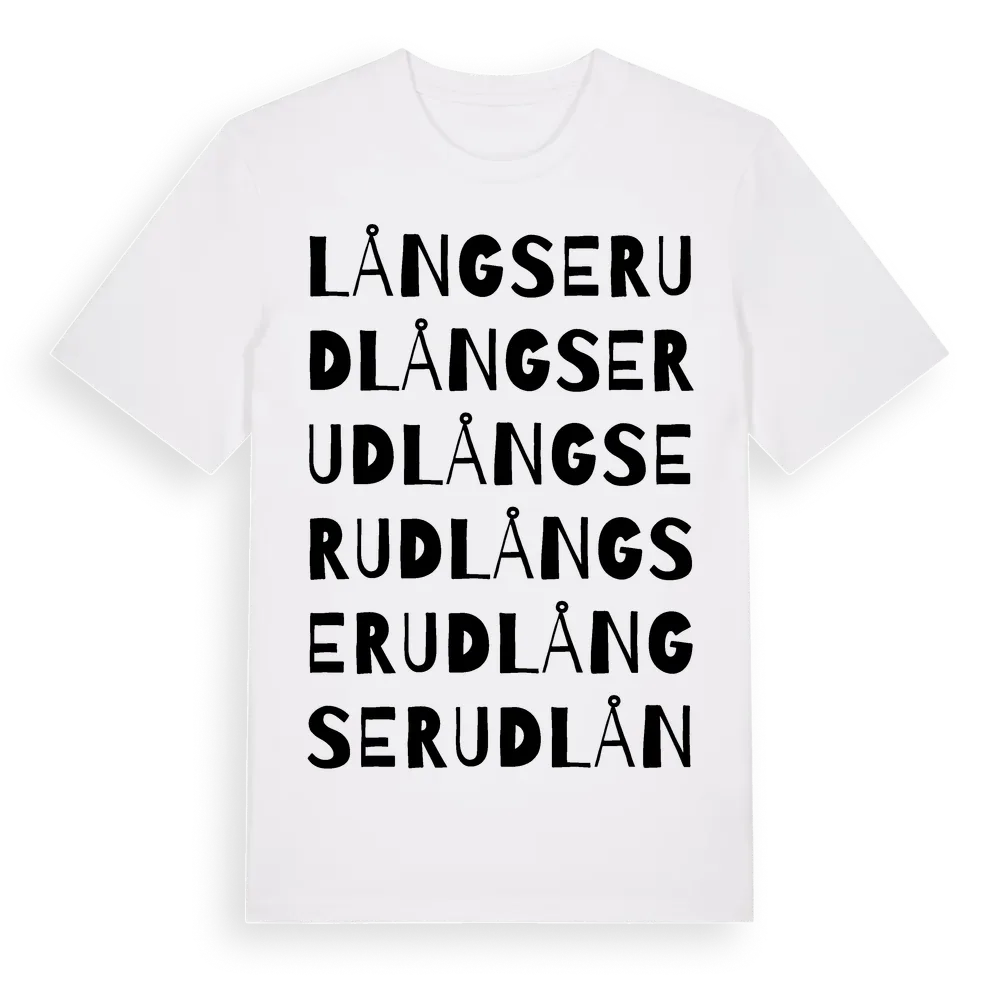 Långserud ordlek t-shirt är inspirerad av byn Långserud i Värmlands län, Sverige. Tröjan är designad för dig som har en speciell koppling till platsen – oavsett om du bor här, har rötterna här eller bara älskar Långserud.