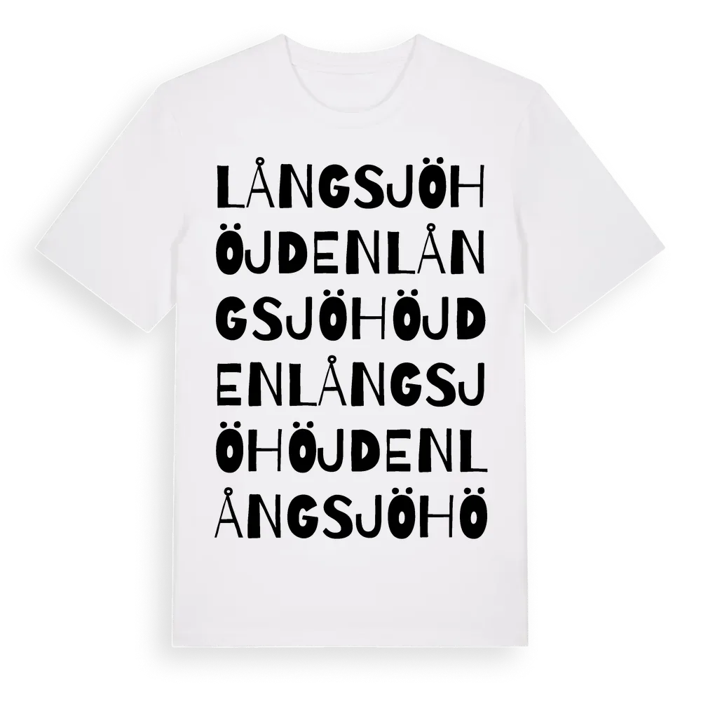 Långsjöhöjden ordlek t-shirt är inspirerad av Långsjöhöjden i Värmlands län, Sverige. Tröjan är designad för dig som har en speciell koppling till platsen – oavsett om du bor här, har rötterna här eller bara älskar Långsjöhöjden.