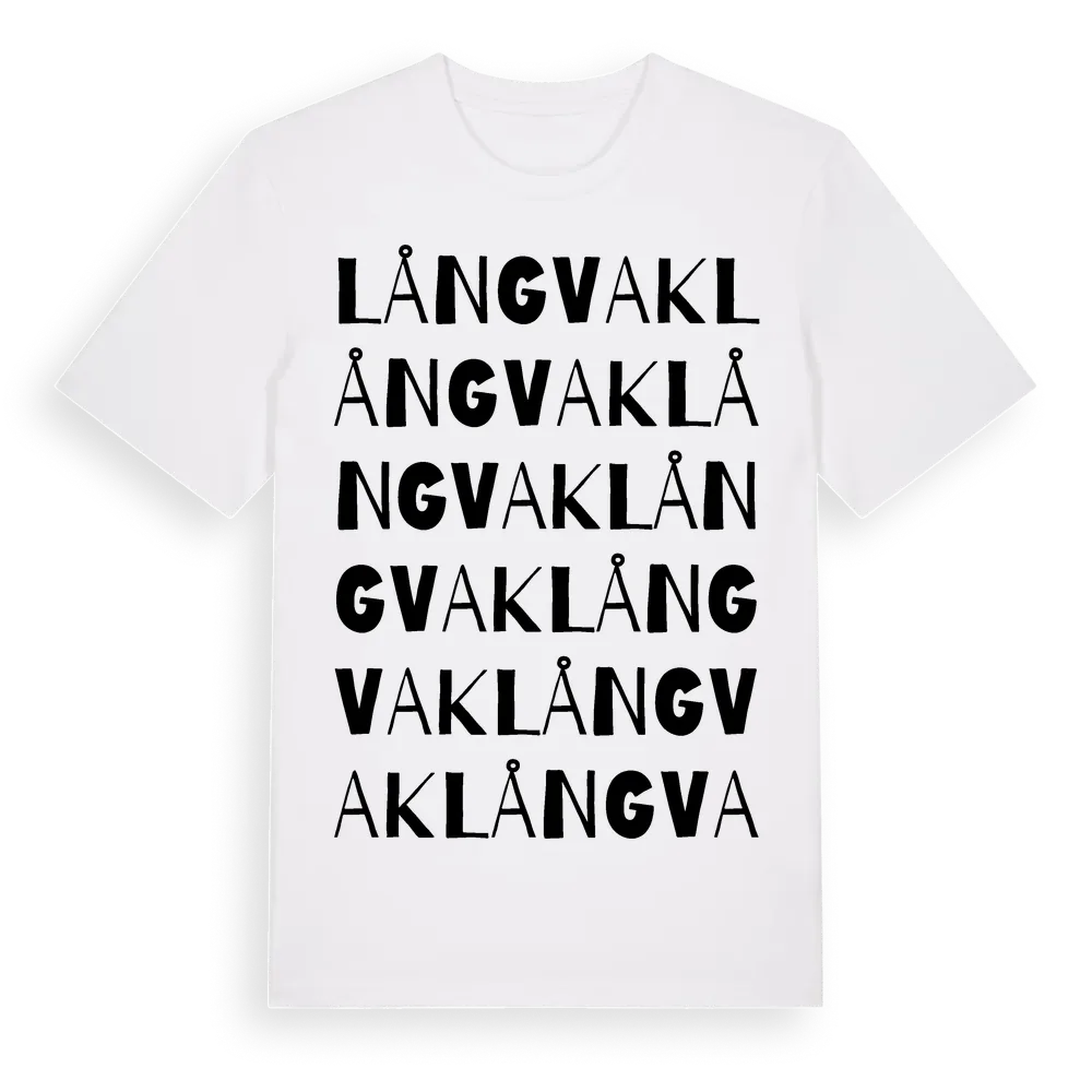 Långvak ordlek t-shirt är inspirerad av Långvak i Värmlands län, Sverige. Tröjan är designad för dig som har en speciell koppling till platsen – oavsett om du bor här, har rötterna här eller bara älskar Långvak.