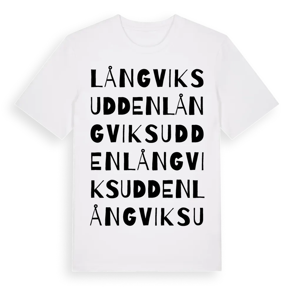 Långviksudden ordlek t-shirt är inspirerad av Långviksudden i Värmlands län, Sverige. Tröjan är designad för dig som har en speciell koppling till platsen – oavsett om du bor här, har rötterna här eller bara älskar Långviksudden.