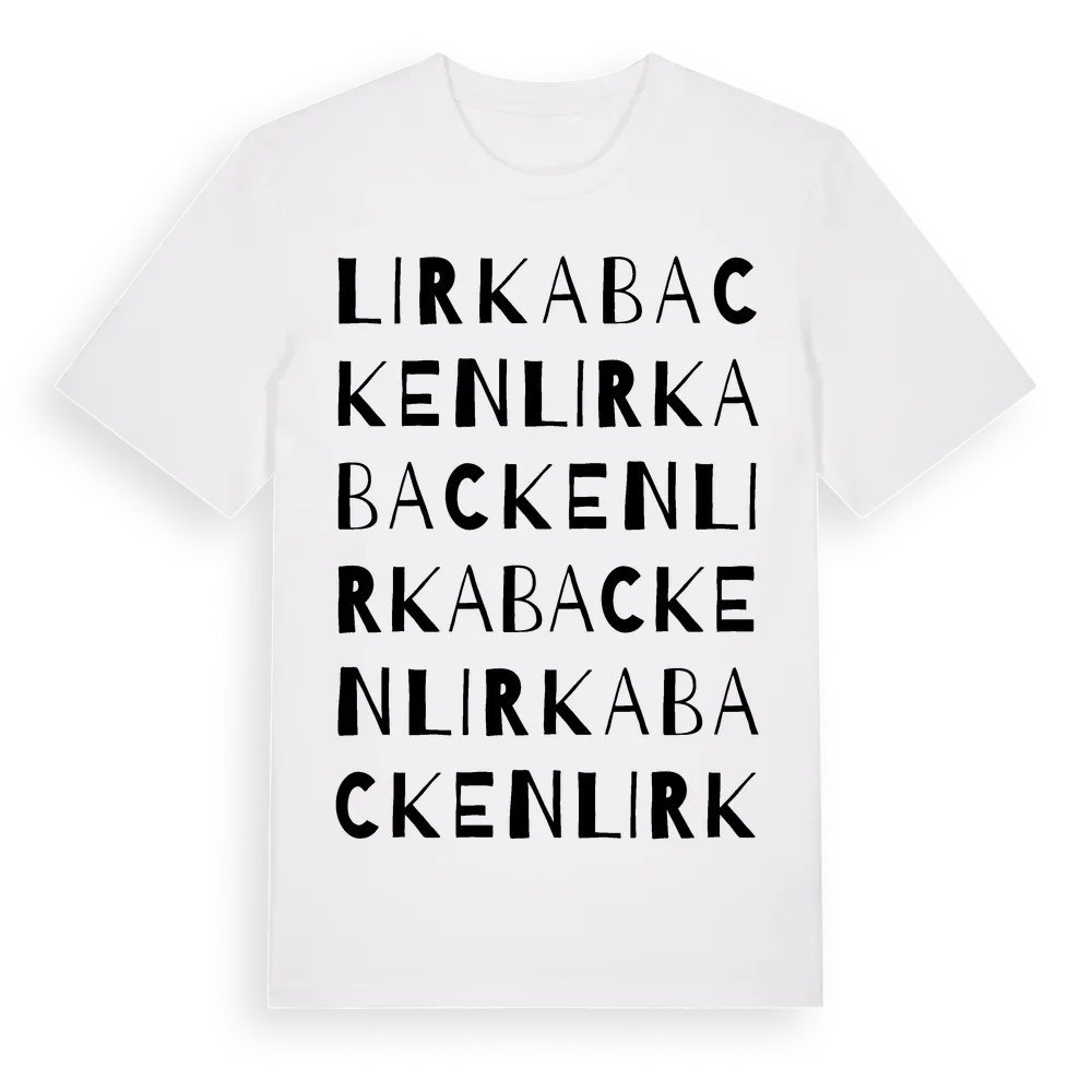 Lirkabacken ordlek t-shirt är inspirerad av Lirkabacken i Värmlands län, Sverige. Tröjan är designad för dig som har en speciell koppling till platsen – oavsett om du bor här, har rötterna här eller bara älskar Lirkabacken.