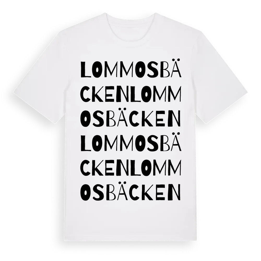 Lommosbäcken ordlek t-shirt är inspirerad av Lommosbäcken i Värmlands län, Sverige. Tröjan är designad för dig som har en speciell koppling till platsen – oavsett om du bor här, har rötterna här eller bara älskar Lommosbäcken.
