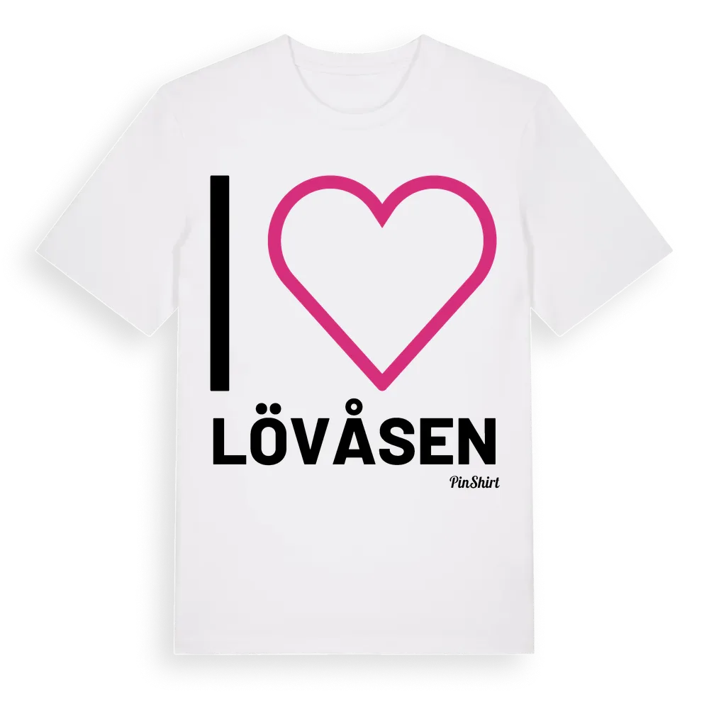 Det klassiska "I ❤ Lövåsen"-motivet i stort format som täcker hela bröstet. För dig som vill visa kärleken till Lövåsen på riktigt. Premium bomull, unisex – från Lövåsen i Värmlands län.
