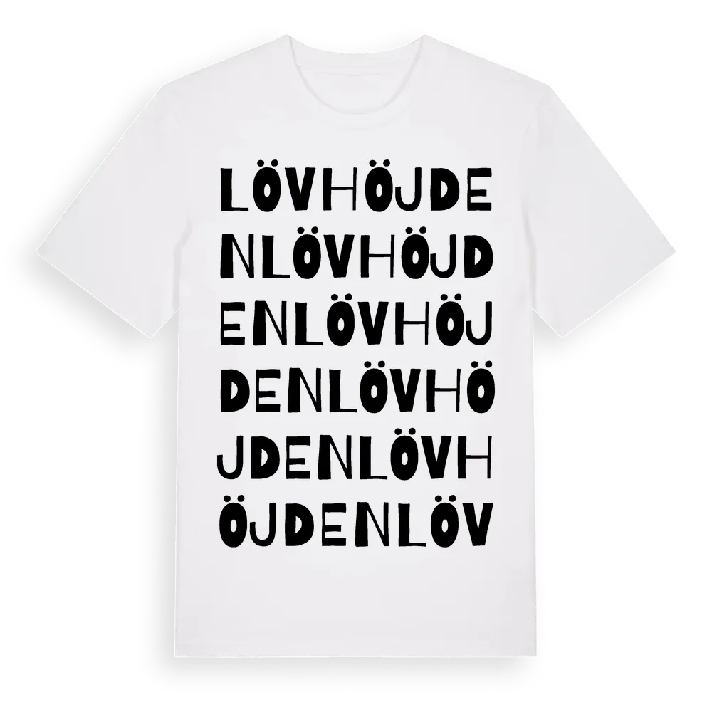 Lövhöjden ordlek t-shirt är inspirerad av byn Lövhöjden i Värmlands län, Sverige. Tröjan är designad för dig som har en speciell koppling till platsen – oavsett om du bor här, har rötterna här eller bara älskar Lövhöjden.