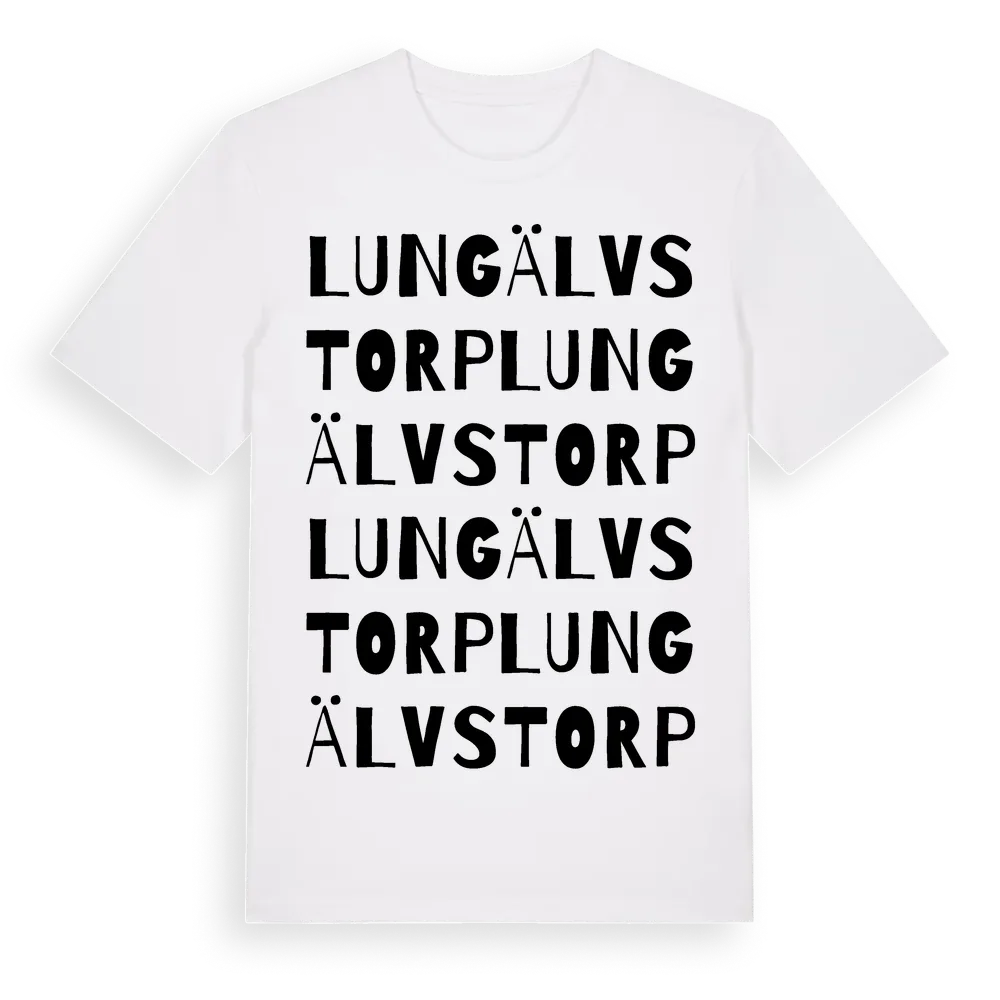 Lungälvstorp ordlek t-shirt är inspirerad av Lungälvstorp i Värmlands län, Sverige. Tröjan är designad för dig som har en speciell koppling till platsen – oavsett om du bor här, har rötterna här eller bara älskar Lungälvstorp.