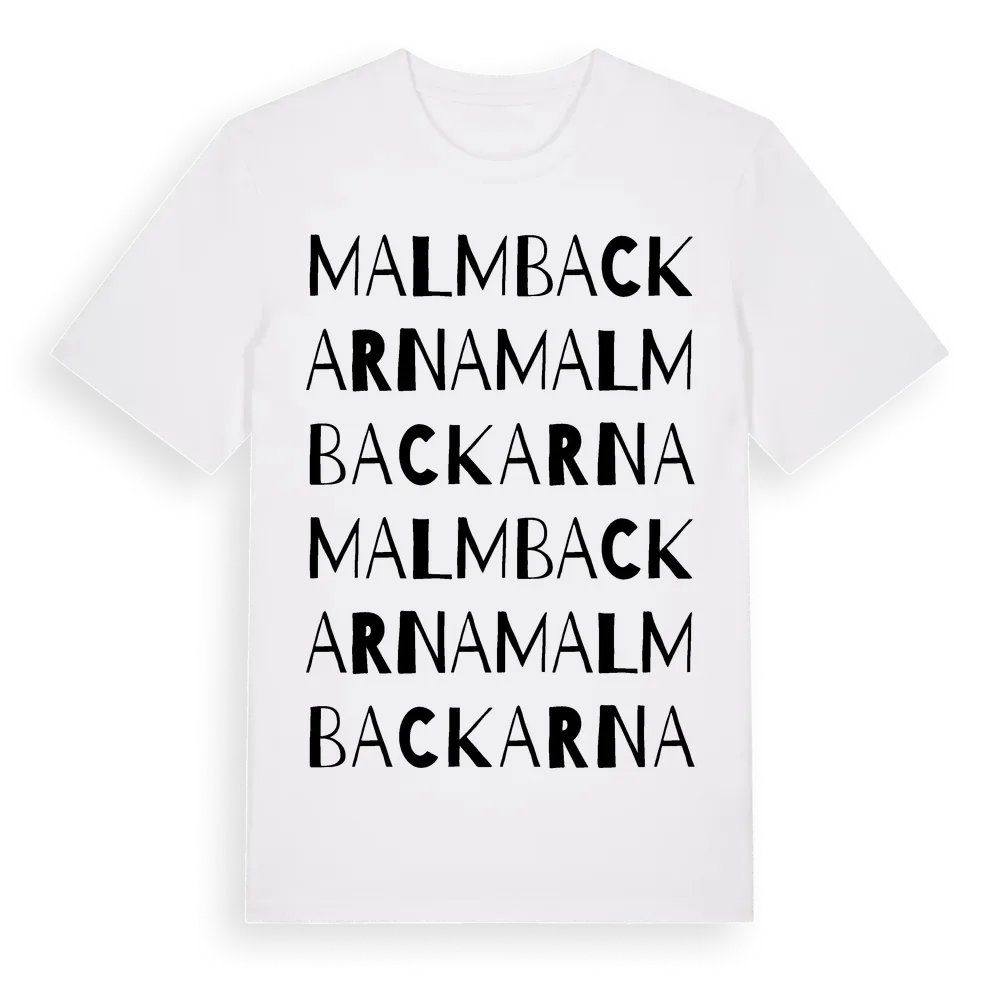Malmbackarna ordlek t-shirt är inspirerad av Malmbackarna i Värmlands län, Sverige. Tröjan är designad för dig som har en speciell koppling till platsen – oavsett om du bor här, har rötterna här eller bara älskar Malmbackarna.