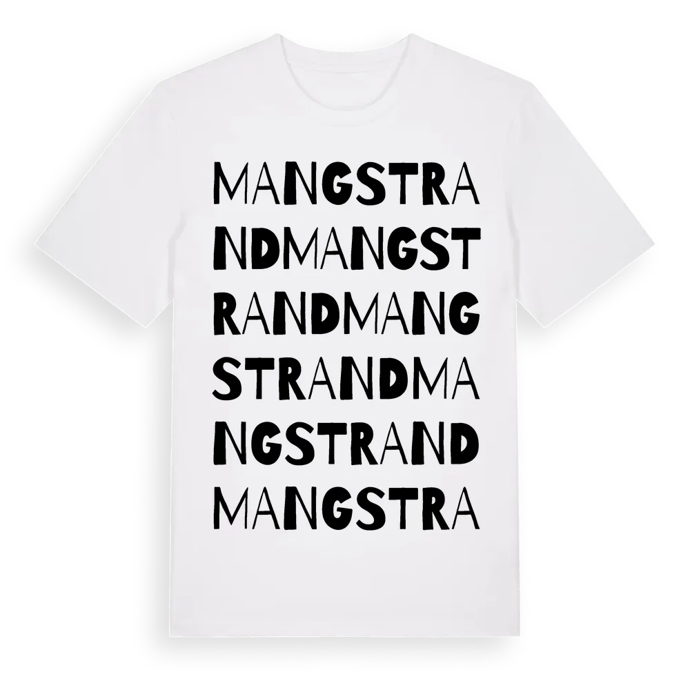 Mangstrand ordlek t-shirt är inspirerad av Mangstrand i Värmlands län, Sverige. Tröjan är designad för dig som har en speciell koppling till platsen – oavsett om du bor här, har rötterna här eller bara älskar Mangstrand.