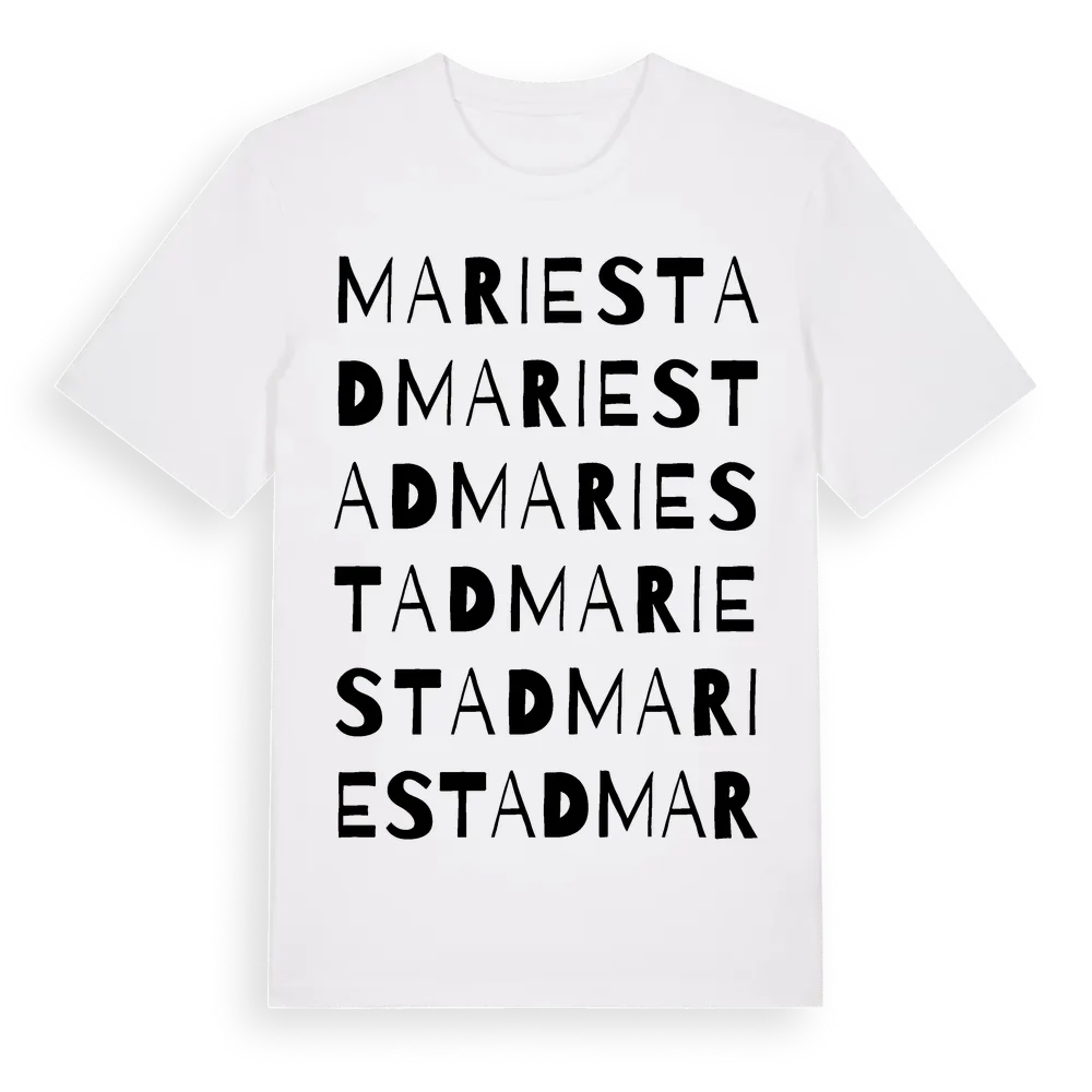Mariestad ordlek t-shirt är inspirerad av Mariestad i Värmlands län, Sverige. Tröjan är designad för dig som har en speciell koppling till platsen – oavsett om du bor här, har rötterna här eller bara älskar Mariestad.